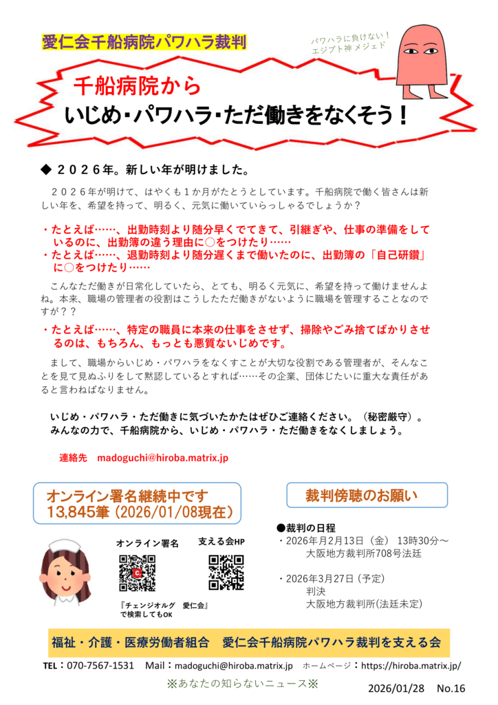 千船病院をふくめて、愛仁会の系列病院からは私たちのところに、職場でのさまざまないじめやハラスメント、ただ働きの報告が届いています。