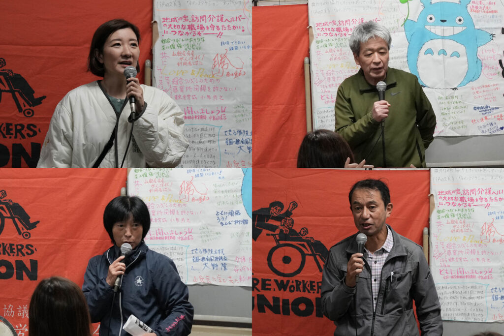 労働組合をつぶすために、訪問介護部門じたいを閉鎖するという法人の攻撃は阻止できず、訪問介護事業と一体となっていたデイサービス部門も閉鎖されて、残念ながら多くの組合員が退職を余儀なくされましたが、今後、山紀会支部はケアワーカーズユニオン西成支部として新たに出発して、西成地域の介護労働者とつながり、利用者さん、家族と絆をむすんで闘い続けます。